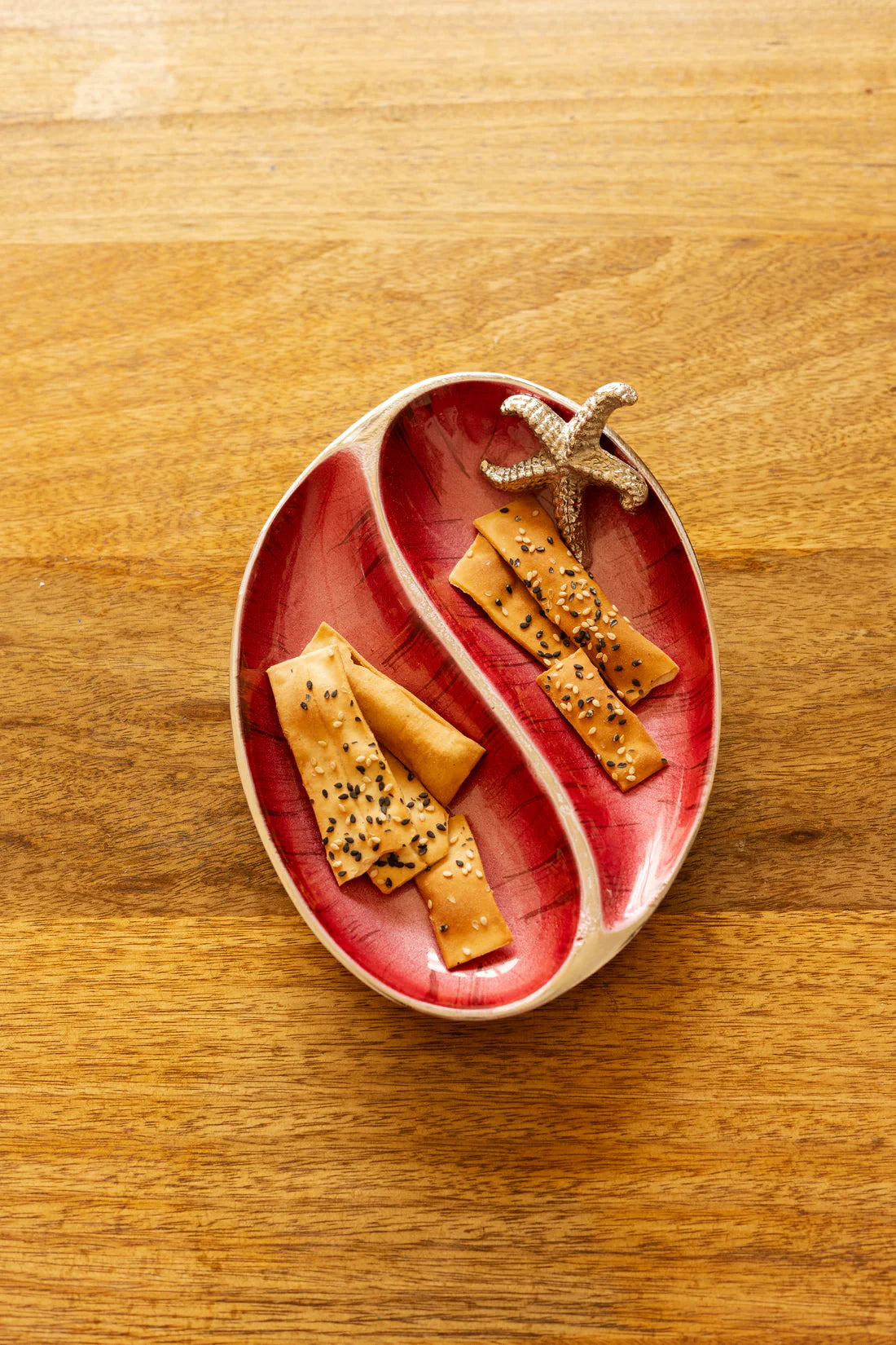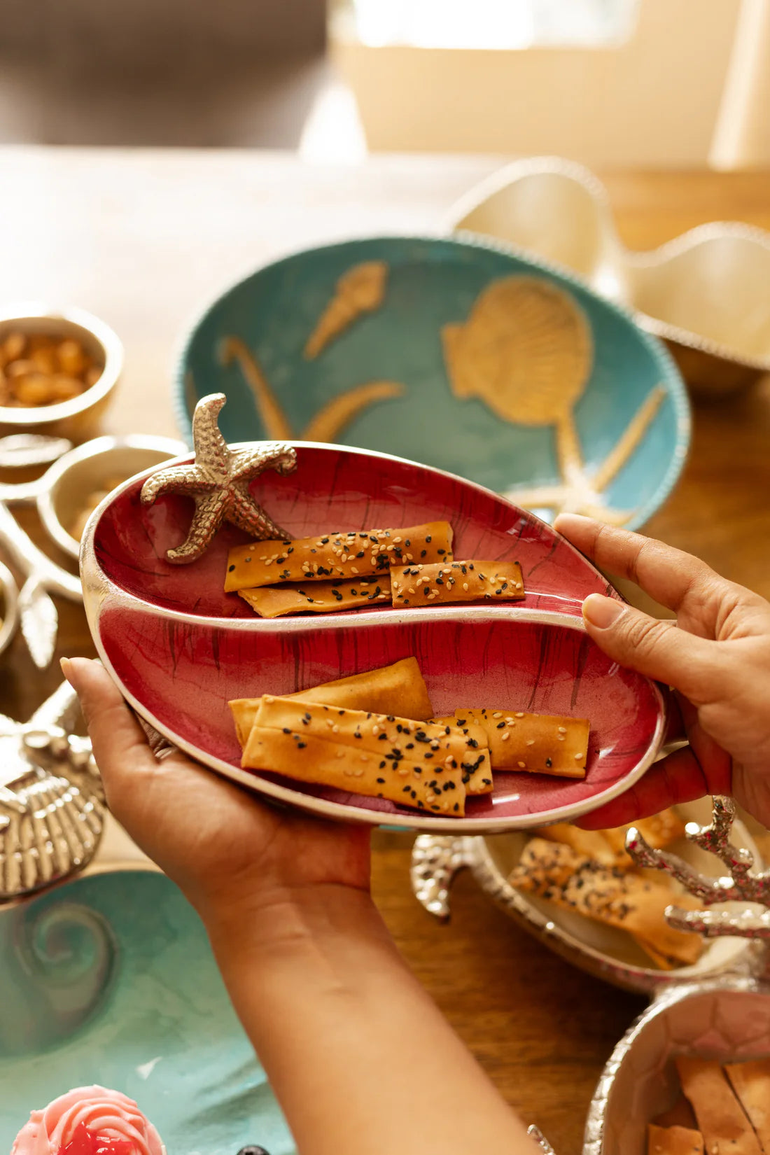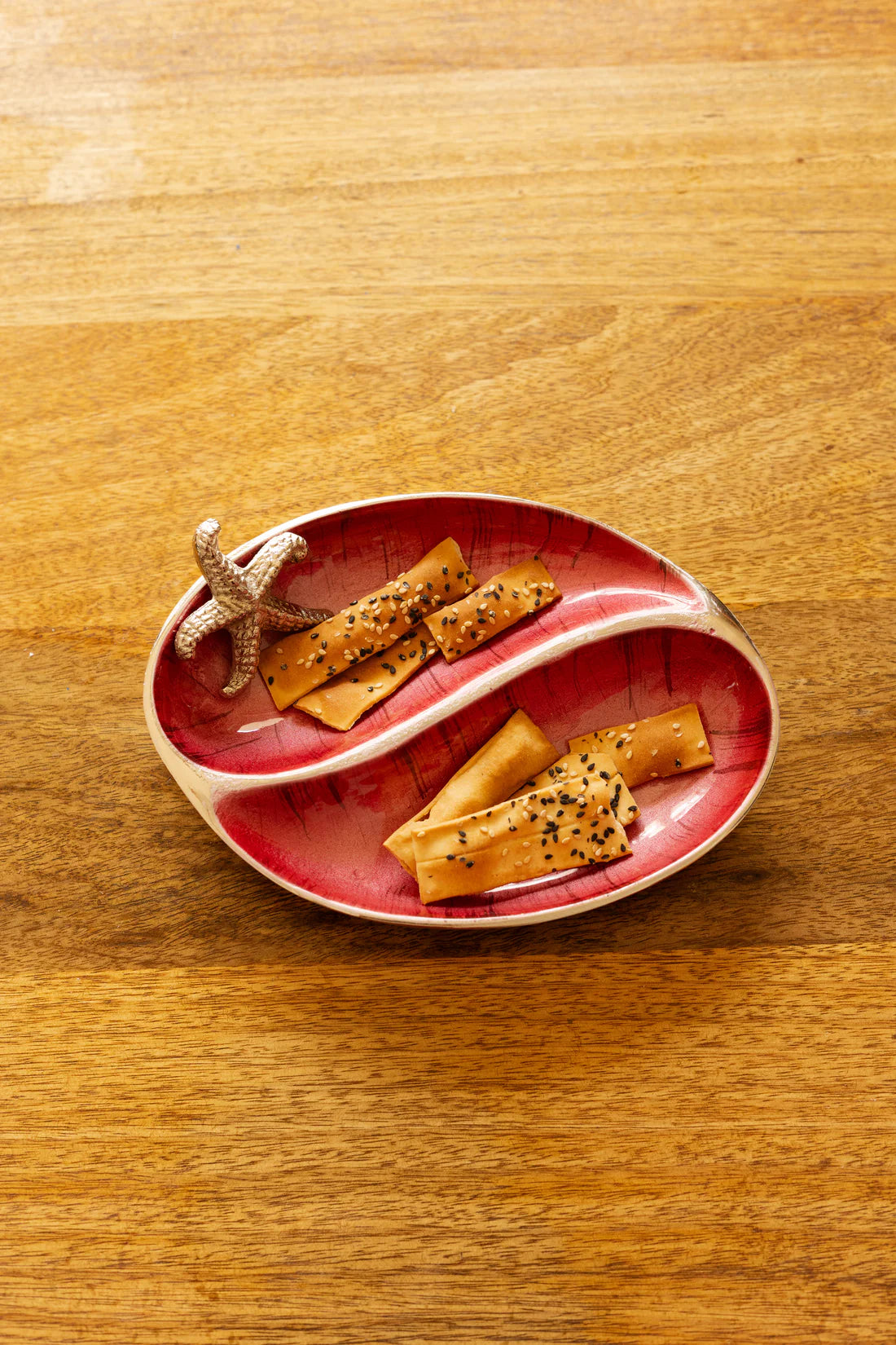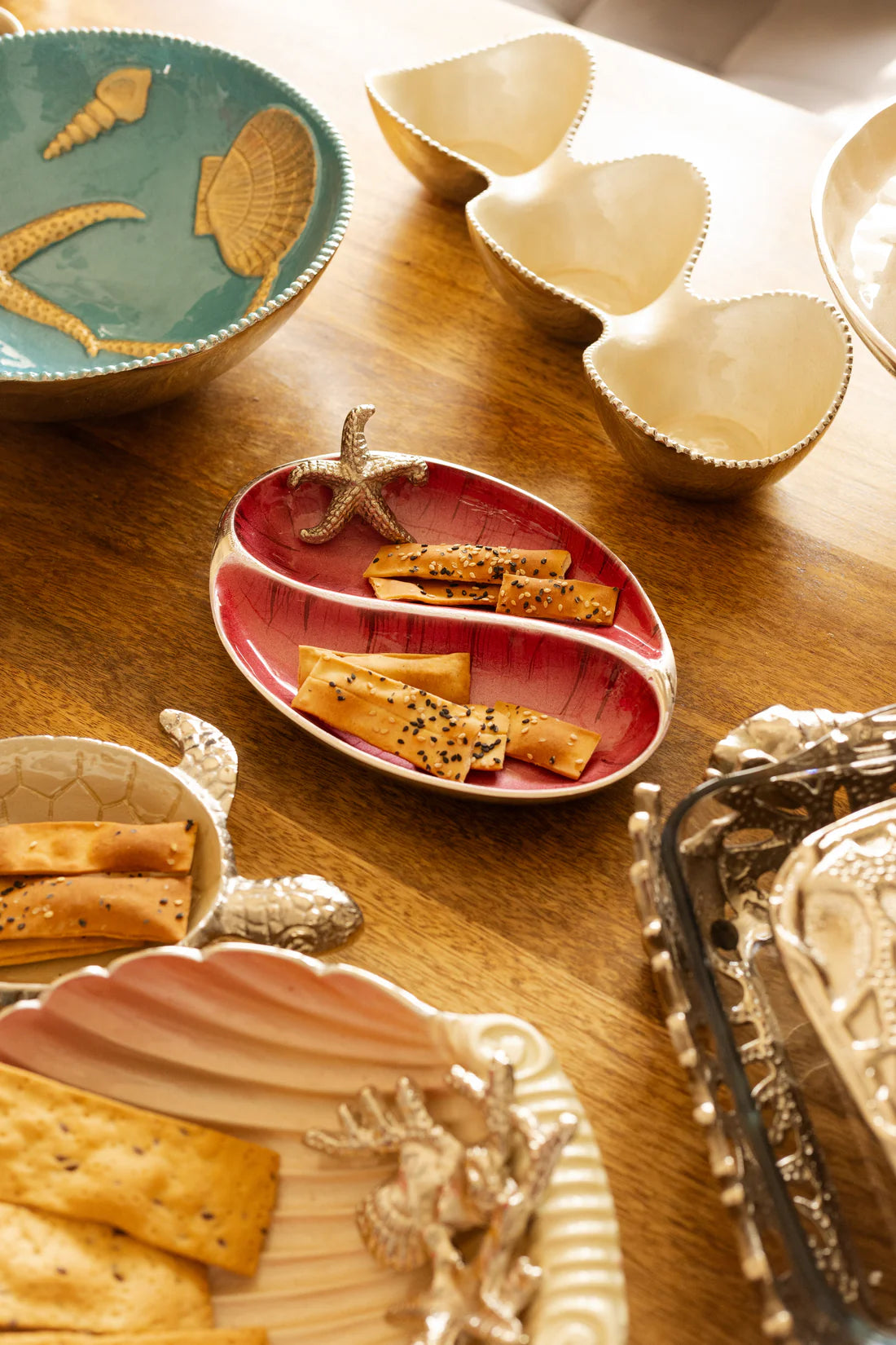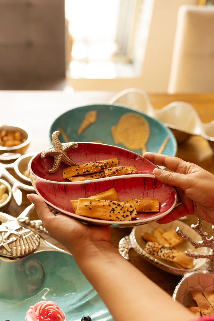 Enhance your serving style with the 2 Section Starfish Server. Crafted with hand-polished aluminium and featuring a radiant, enamel-finished interior, this server offers two compartments for presenting a variety of treats. Adorned with a detailed starfish accent, it brings a touch of coastal charm to any occasion. Perfect for hors d'oeuvres, appetizers, or desserts, this server combines functional design with artistic flair, making it an essential piece for elegant entertaining.