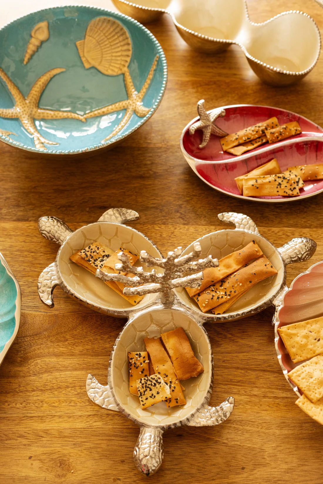 Add a whimsical touch to your table with the 3 Section Turtle Condiment Server. Crafted with hand-polished aluminium, this server features three charming compartments, each shaped like a turtle shell, perfect for presenting an array of condiments, appetizers, or snacks. The interiors are lined with a smooth, easy-to-clean finish, while the detailed turtle design brings a playful, coastal elegance to any setting. Ideal for gatherings, parties, or everyday use, this server combines functional design with delightful seaside artistry.