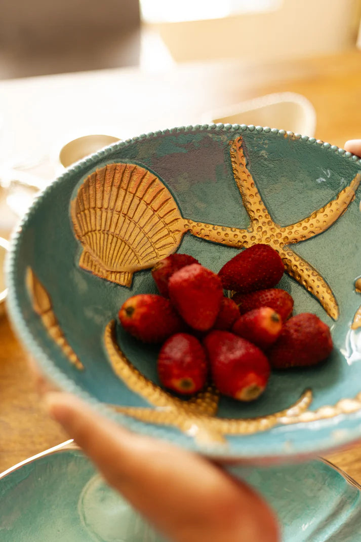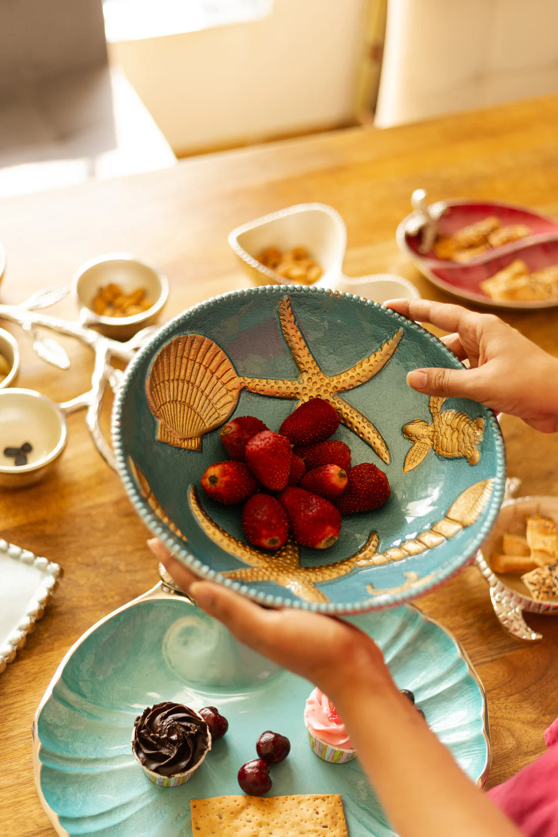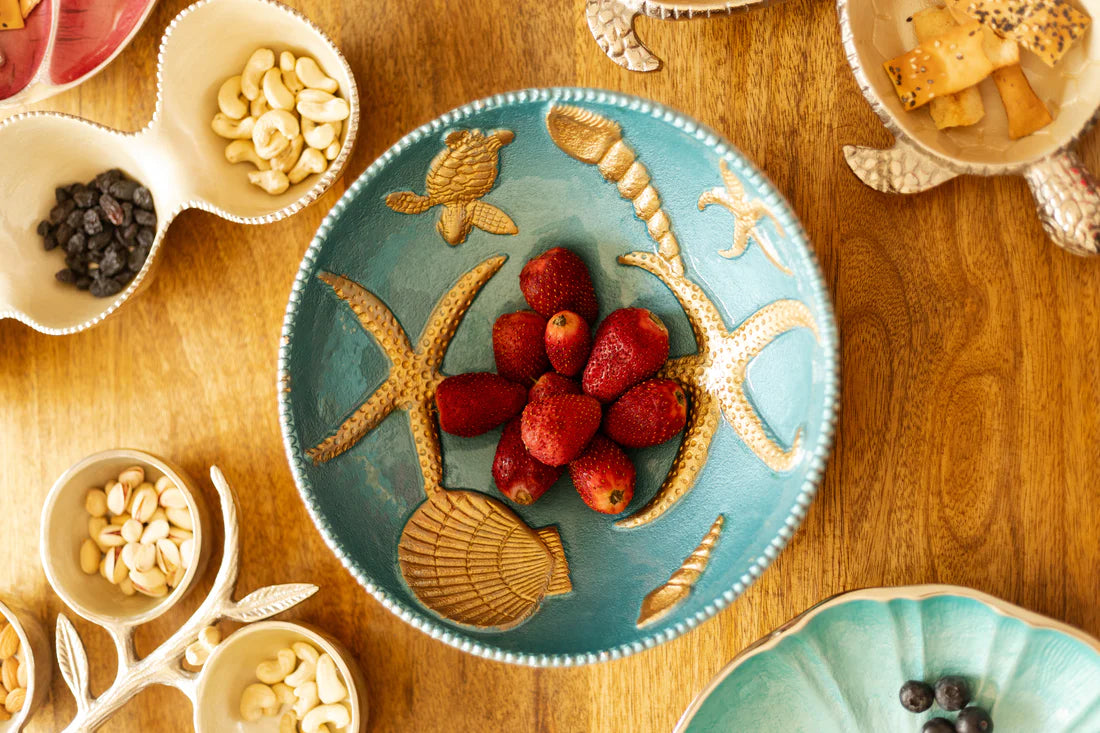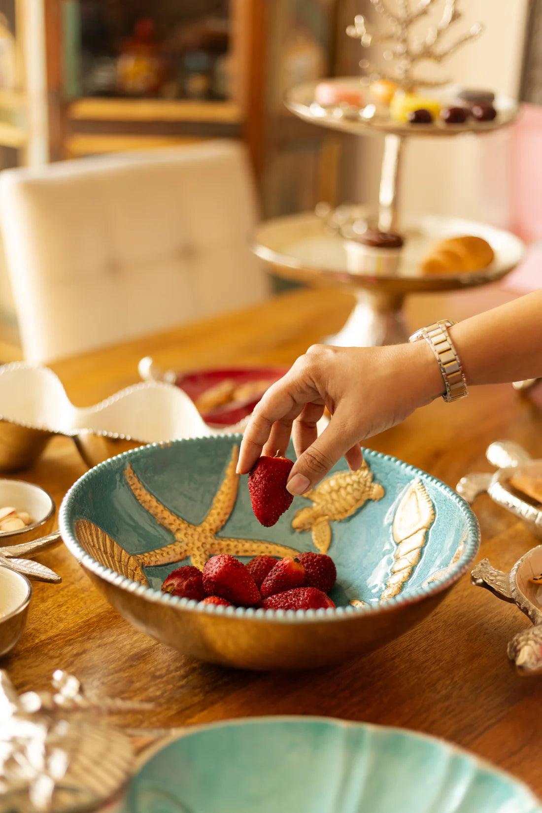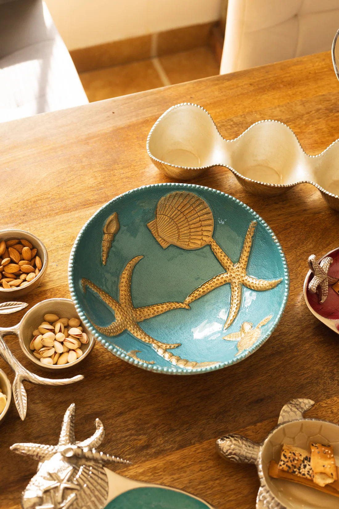 Capture the essence of ocean life with the Oceanic Bowl, featuring a serene, aqua-toned interior adorned with sculpted golden starfish, seashells, and a turtle motif. Crafted with durable, hand-polished aluminium, this bowl adds a touch of coastal charm to any setting. Perfect for serving fruits, snacks, or decorative accents, it transforms everyday items into treasures of the sea.