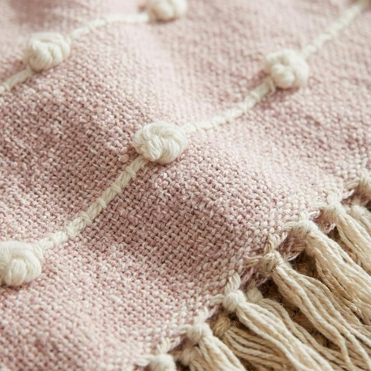 Intricate Detailing: Each throw features rows of delicate, hand-finished tufted pom-poms and subtle linear accents for a sophisticated, bohemian look.